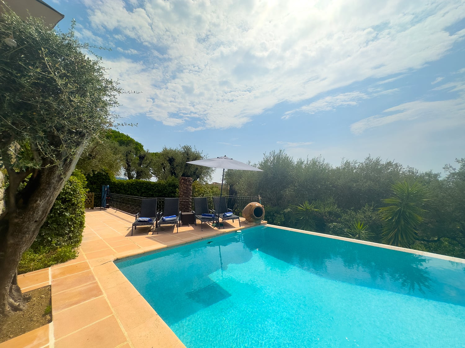 Mediterranean garden of 2,000 m² with olive trees and swings. Private infinity pool 10m x 5m with sun terrace and loungers. Shaded seating area with table and chairs.