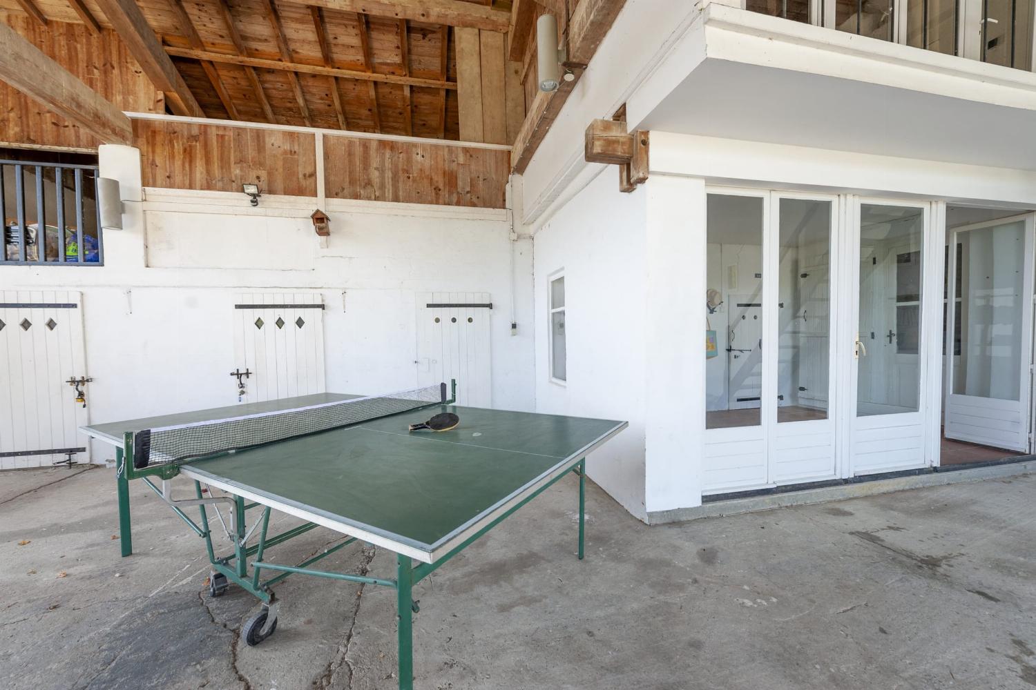 Open barn with table tennis, dining table and chairs.