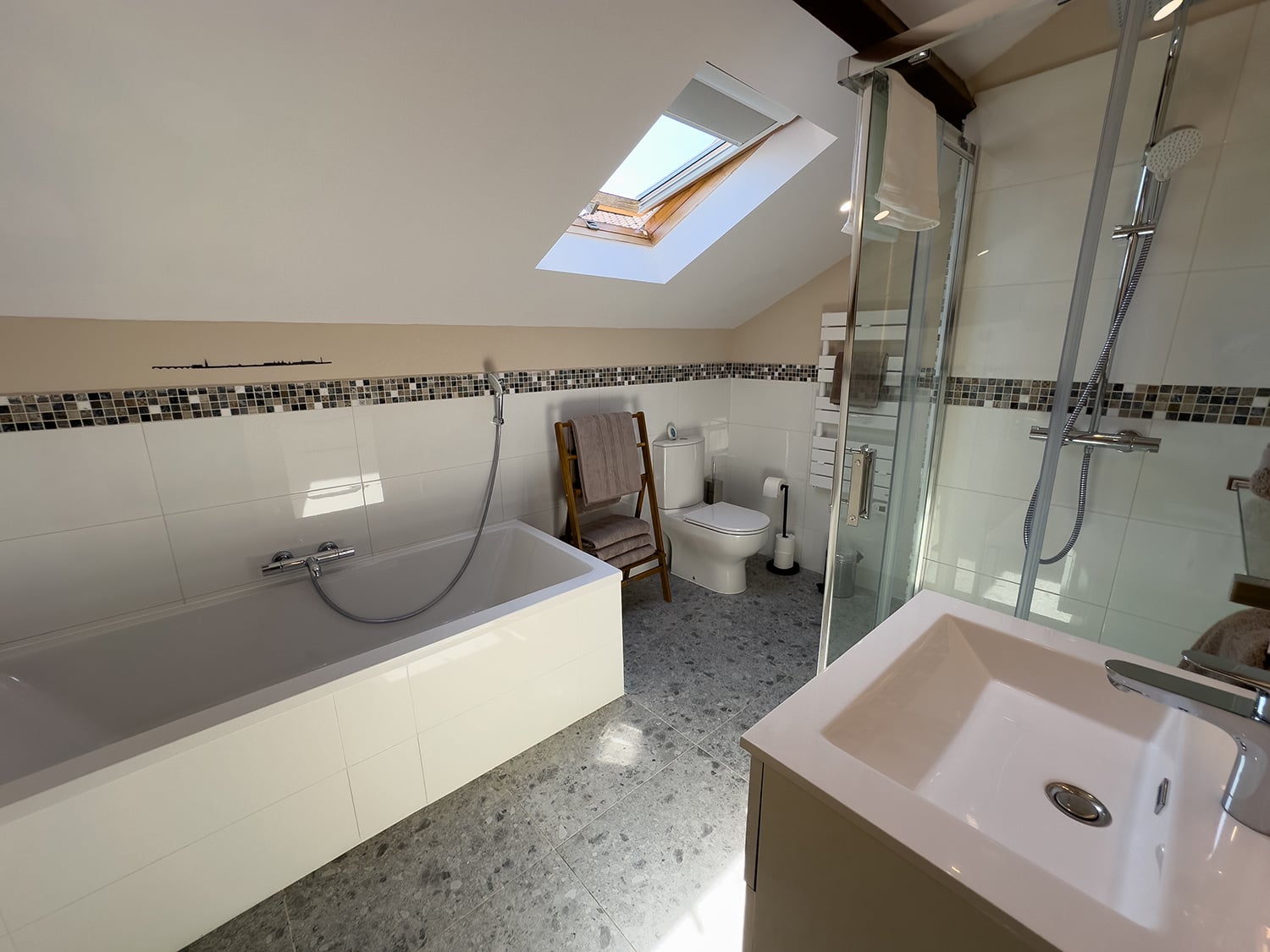Separate bathroom with WC, bath / shower, separate shower and hand basin.