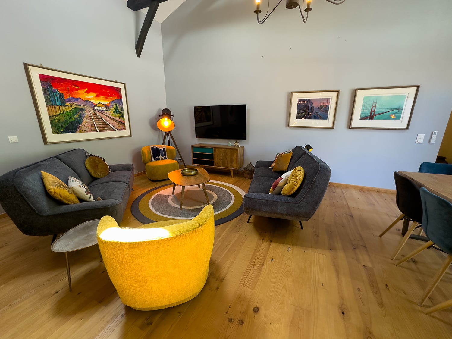 Beamed ceiling, sofas, wall-mounted Smart TV and fibre-optic Wi-Fi internet.