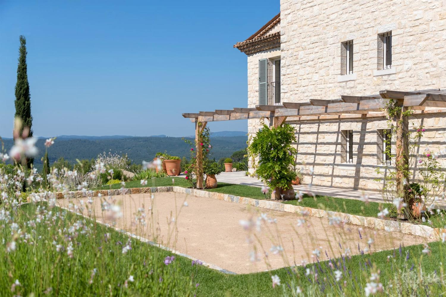 The house sits in 4 hectares of private grounds and has stunning, South-facing views. Large boules court.