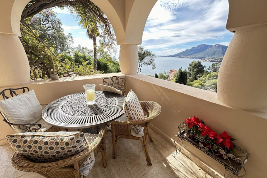 Maison Esquillon has a panoramic view of the Mediterranean Sea, this remarkable residence is set back from the seafront with a large private garden in Théoule-sur-Mer.
