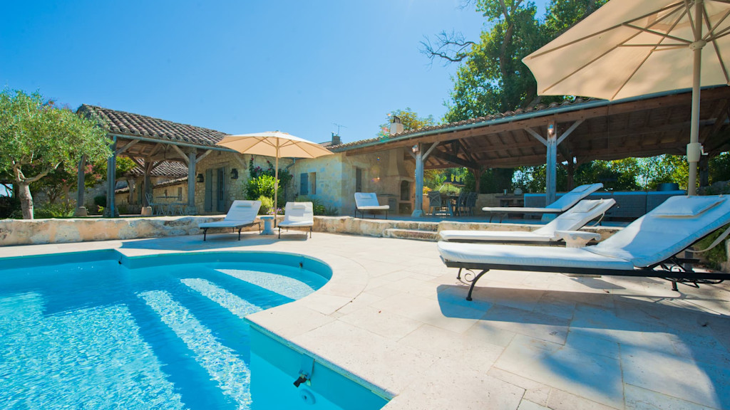 Grand jardin avec pelouse et piscine privée de 10m x 5m avec terrasses au bord de la piscine et grande cuisine d’été ombragée ainsi que salon et espace pour les repas.